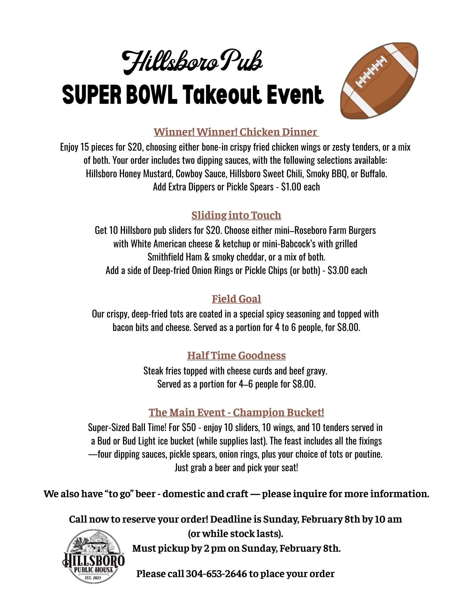 Hillsboro Pub SUPER BOWL TAKEOUT
